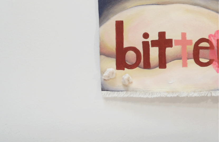 The micro-exhibition emerges from my visceral, gut-wrenching responses to this increasingly (binary) gendered social media context. The work is plastered with scrapbook kit stickers and seeped in sticky, glittery spite (born of deeply felt personal struggle and outrage as commonplace and insignificant as a vigilant duster’s crusade on under-bed dust bunnies). The work points to viciousness within choruses of I’m just a girl, and the rise of rinse-and-repeat rulebooks for the spectrum of girlhood. Pulling at carefully arranged croquette bows, playing with girl dinner, and dissecting girl math, loops of reason are worn down to their ridiculous cores. The micro-exhibition interrogates the IRL consequences of girlhood’s URL reign. The sculptural work is made entirely from chewed sugar-free chewing gum, a substance that is sticky and malleable and fossilizing – it holds the marking of teeth’s labour. Selected to arouse disgust, this humble material (employed by many to curb hunger during periods of disordered eating) corrodes girlhood’s paraded innocence with bodily crudeness. As a material, it is explicitly not sexual, but bodily markings and traces of fluids place it in a strange liminality. Crushed between the fingers, moulded and prodded it becomes a gut or vomit-like material that perhaps could seep through cracks in sugary sweet façades.