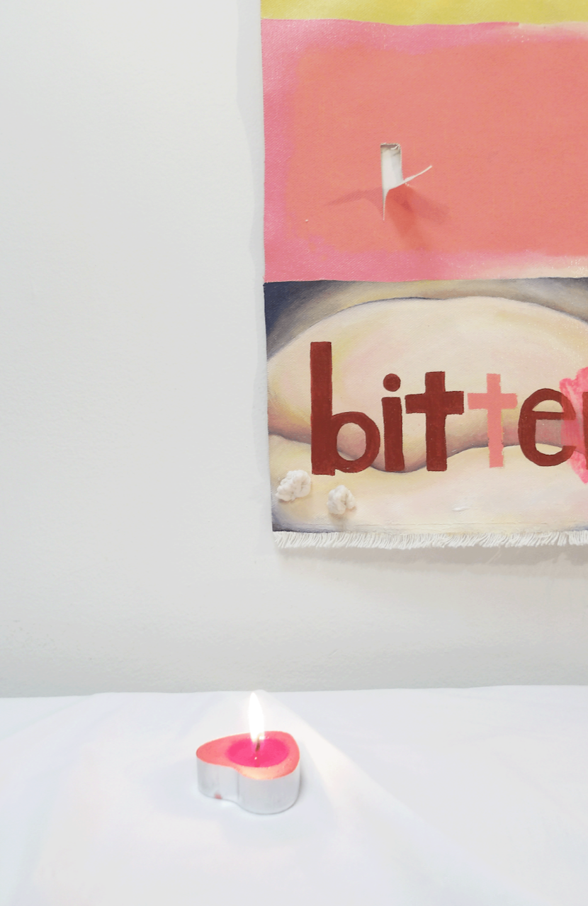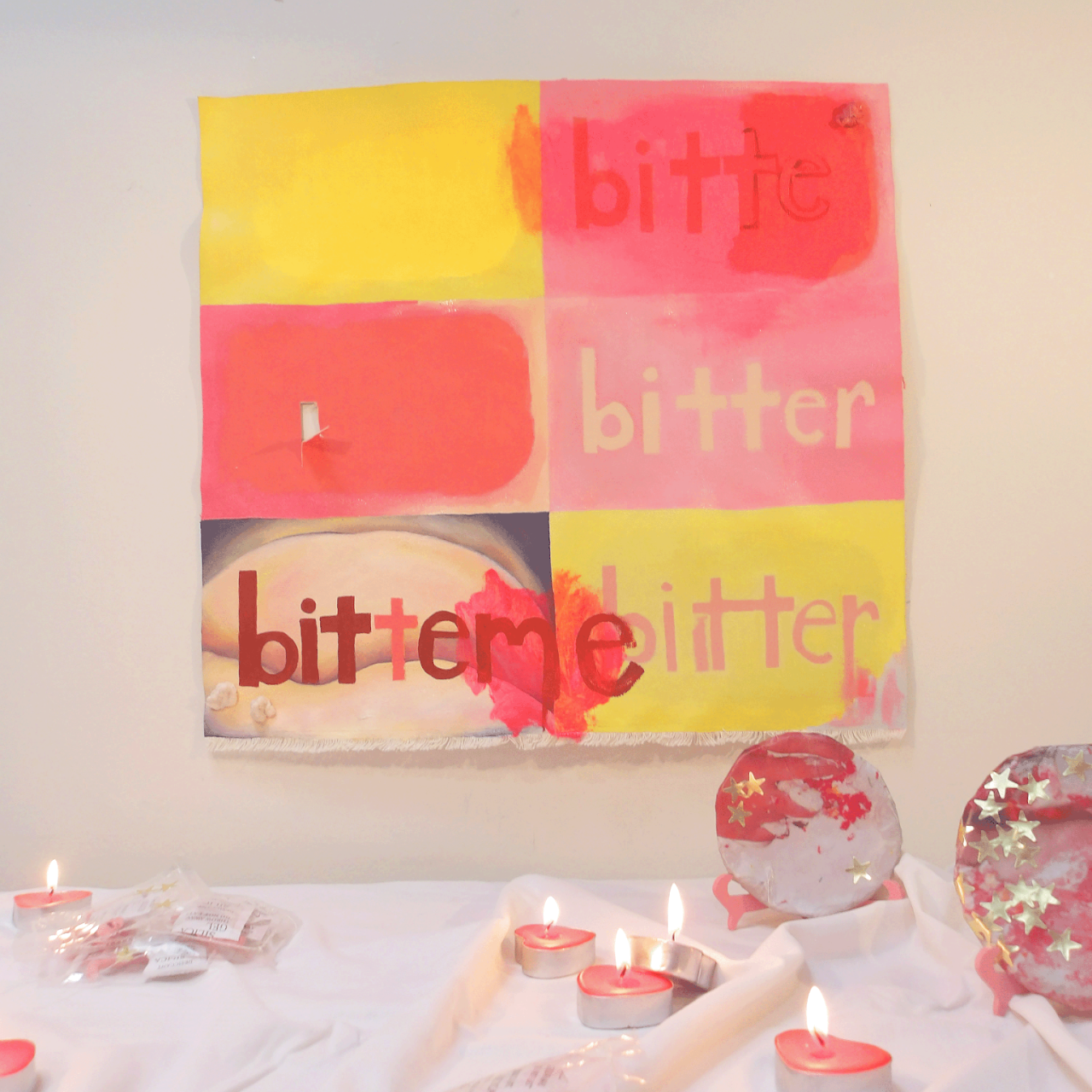 cake crumbs, 2024, chewed gum (sugar free), tinfoil, canvas, cotton thread, oil paint, acrylic paint, scented candles, papier mâché, plywood, super glue, silk, gold star stickers, enamel spray paint, silica gel, plastic, machine stitching