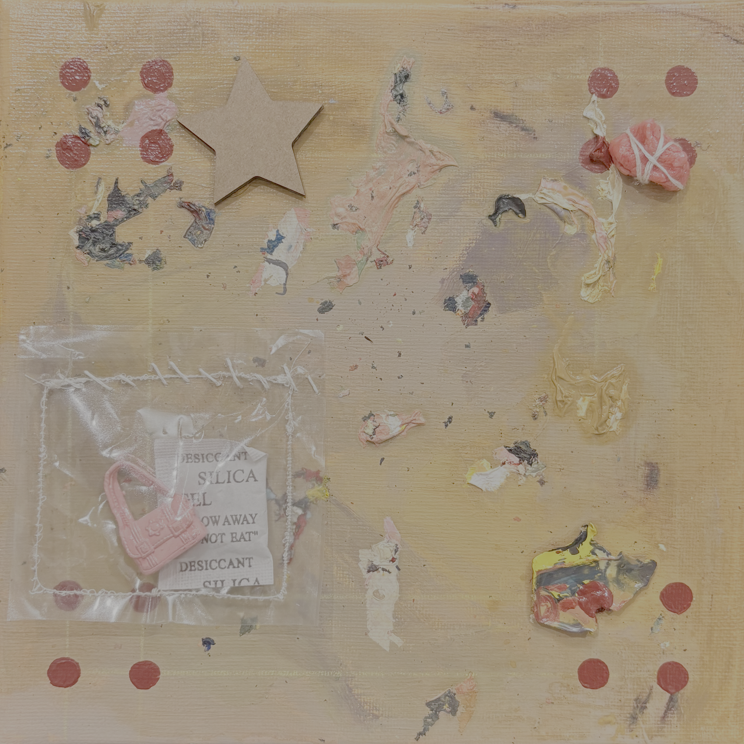 is nostalgia helpful here? (2026) acrylic paint, dried palette scrapings, cardboard, chewed gum, embroidery thread, chalk pencil, polly pocket bag, spray paint, clear gloss spray, plastic, and silica gel on canvas, 20 x 20 cm